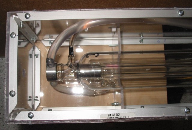 Der Laserausgang von Oben. Die Elektrode habe ich übrigens mit einer 2,6mm Buche angeschlossen, wie man sie bei Fischertechnik/Lego verwendet. Das Zündkabel einfach in die Steckeraufnahme gelötet und mit der Verschraubung an die Elektrode befestigt.