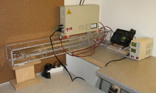 Meine kleine Laserecke. Die Röhre habe ich in ein Plexiglasgehäuse gebaut. Somit ist sie vor runterfallenden Dingen wenigstens etwas geschützt. Das Gehäuse hat weiterhin die Anschlüsse für Spannung und Wasser integriert. Der Kühler hat immer noch einen Lüfter, aber ich suche noch. Die Stromversorgung für den Kühler (Pumpe & Lüfter) muß ich auch basteln. Zusätzlich werden ja auch  Sicherheitsschalter eingeführt, damit der Laser nicht lasert, obwohl gar kein Wasser fließt. Die Hochspannungsleitungen werden auch vernünftig verlegt werden und die Widerstände durch andere ersetzt.