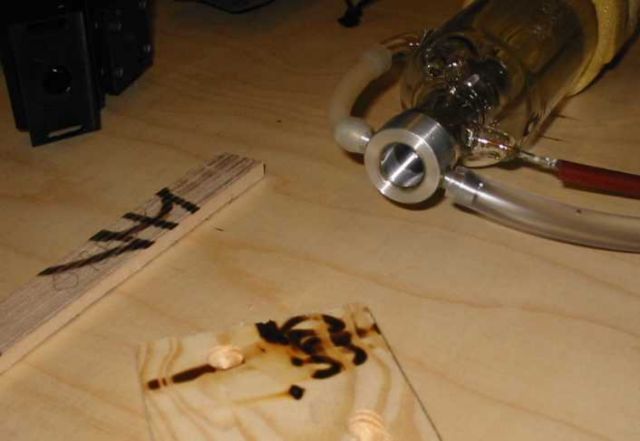 Das sind die ersten Ergebnisse mit Holz. Ich habe den Strahl nicht fokussiert und bin einfach mit einem Stück Holz in den Strahl gegangen. Innerhalb einer Sekunde wird das Holz verkohlt und es bilden sich Flammen.